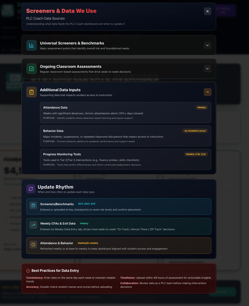 Say goodbye to initiatives that fade away. With our PLC Coach partnership, we ensure every educator knows their next steps, data is actionable, and interventions are tracked for success.