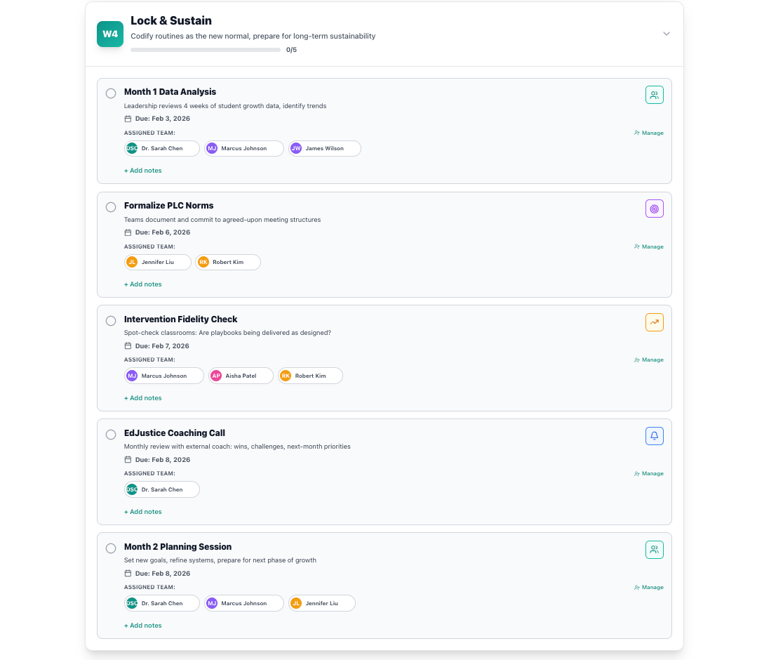 Student interventions match automatically because the system plays show exactly what to do at each stage. Monday morning comes and everyone knows what play to run.